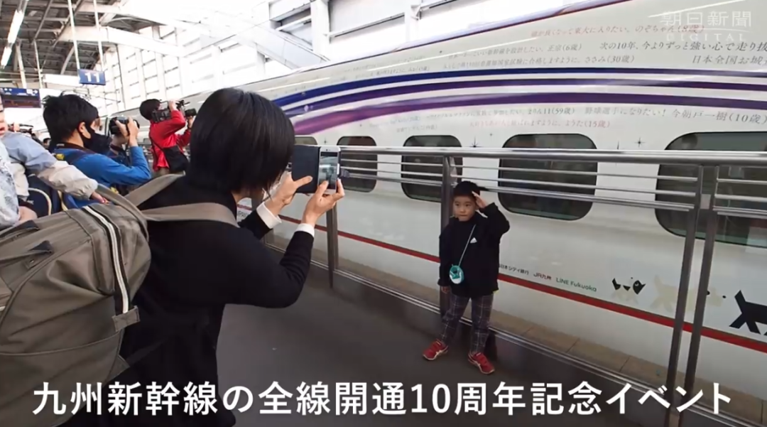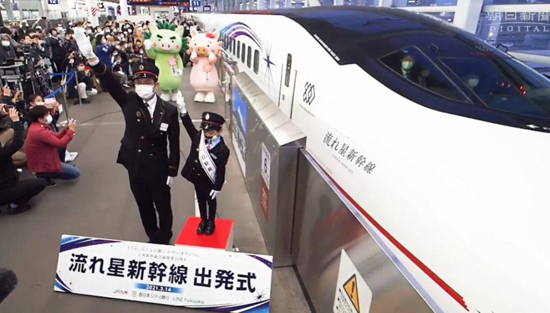 来自熊本县阿苏市的5岁男孩小西一晴的愿望是“希望当一天站长,主持发车典礼”,他的愿望也实现了。由小站长打出发车手势后,“流星新干线”缓缓驶出了月台。