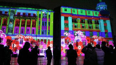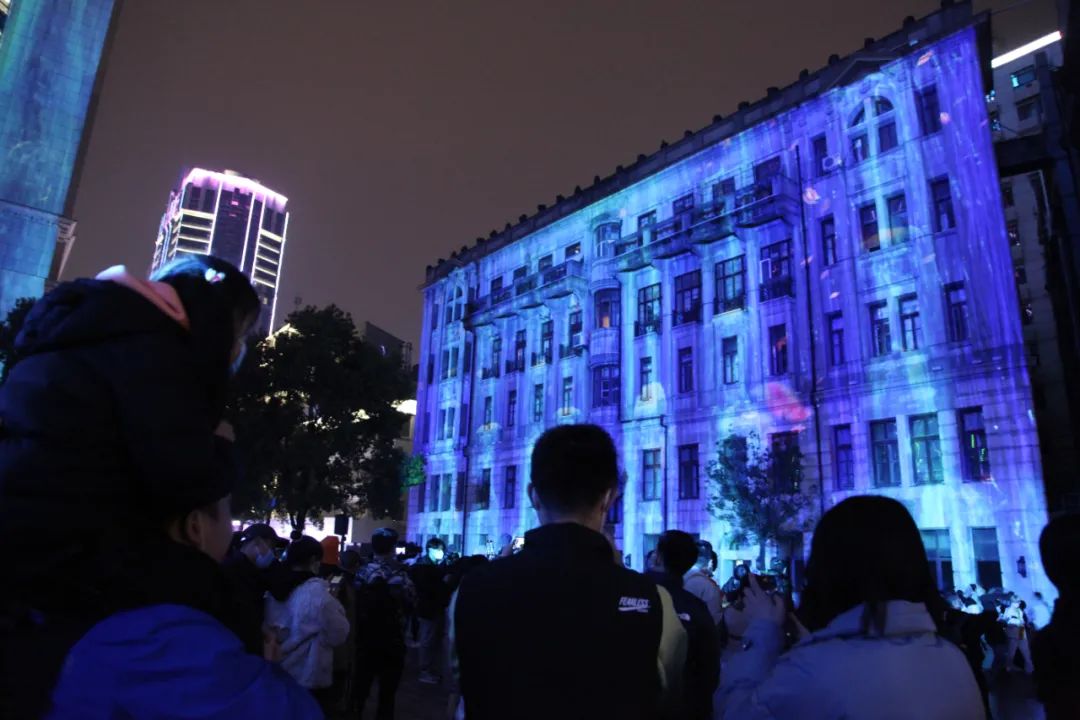 数字光影技术湖北省工程研究中心将江汉路江汉关至怡廉里时光博物馆路段,打造成5000平米城市级沉浸式影像空间,众多市民游客纷纷驻足,在光影中合影留念。