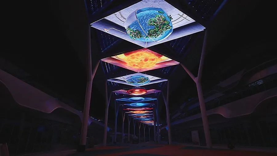 贵州天文小镇 ,利亚德智慧显示3725㎡创意天幕透明屏。天幕街总长约470米,分成东区天幕、中区虫洞、西区天幕三段,是全球最大的异形LED天幕。天幕演绎秀作为天文小镇的核心文化体验业态,将围绕天文主题,以星河为幕,联动入口休闲广场、星际之门及街区大型建筑,利用先进的声、光、电、视觉手段,结合异形LED天幕,将演艺系统及互动体验系统与商业模式完美融合。