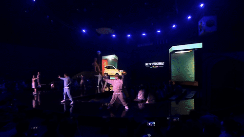 OpeningVideo结合一段青春洋溢的舞蹈演绎为发布会定下潮酷基调,视觉部分尤其抢眼,BOX屏和背景大屏的内容分配和谐统一,利用BOX结构本身的特点,在三个盒子内完成了各种材质的填充,为我们呈现了马卡龙春色的各种可能性,时而粒子感、时而果冻感,时而植被的生长,都是对色彩主题准确亮眼的表达。