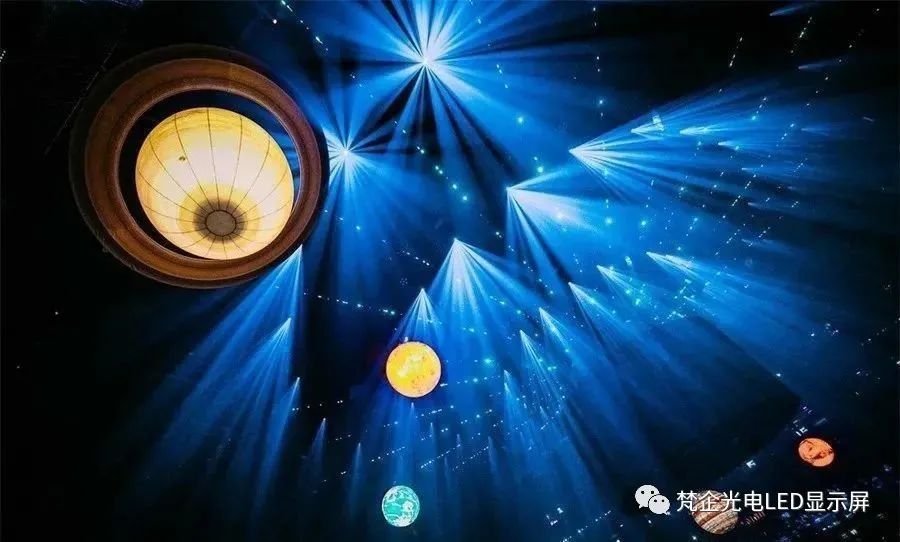 场内悬挂起银河系八大星体,灯光渐暗,星球缓缓转动,仿佛置身银河。