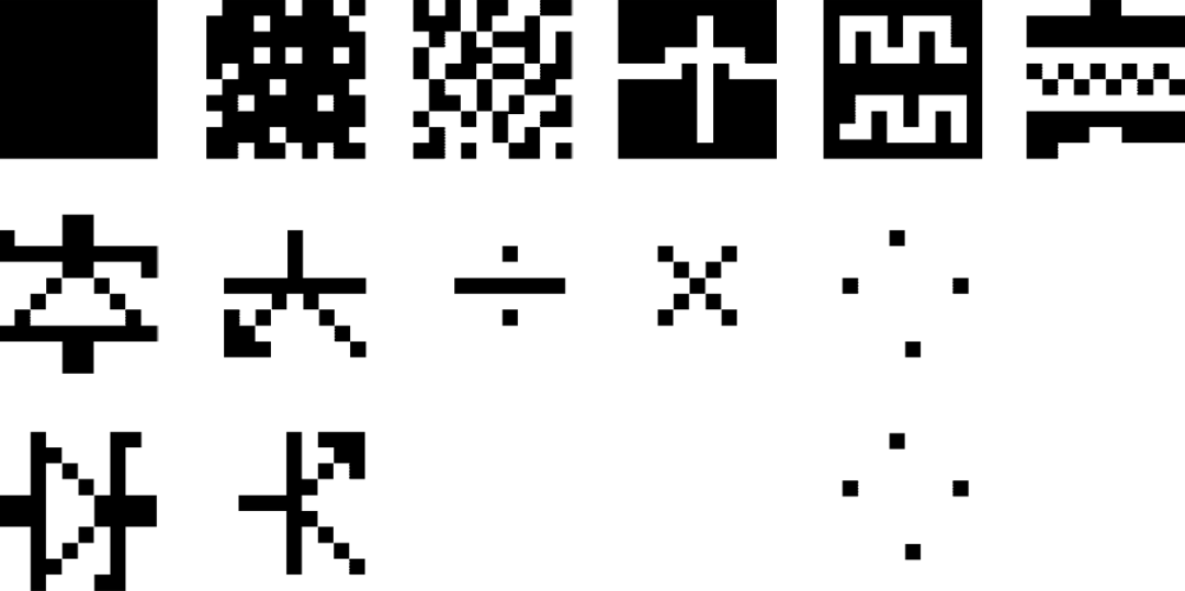 符号的第一行以一个简单的黑色方形开始,然后是两个不同密度的随机棋盘格。接下来的三个符号是一个交叉的电线图案,一个随机图案和一个磁带机图案。布尔顿并不确定为什么在磁带机的左下角会有两个额外的像素,也许是很小的密度调整。