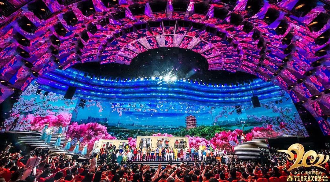 “祝福声声贺新岁,欢歌笑语迎牛年”,每年陪伴全球华人的“年夜饭”——央视春晚如约而至!聆听时代声音,感受社会脉动。2020是极不平凡之年,中国人民迎难而上、百折不挠,取得了巨大成就。晚会紧跟时代主题、紧扣社会现实、紧贴火热生活,在春风化雨、润物无声中用生动、形象、深刻的艺术作品唤起全国人民的年度记忆,联结时代共鸣、激荡情感共振。 继“AI智能裸眼3D舞台”之后,大丰再接再厉,为全国观众带来了高科技的舞美视觉体验。整台晚会既突出中国元素、民族特色,又激扬世界多彩文明之美。智能化的舞台设备技艺精湛、匠心独具,更加凸显美轮美奂的舞美效果,让整个晚会焕发出蓬勃的生命力,为全球华人献上一台强信心、聚民心、暖人心、筑同心的文化盛宴。 春晚不仅是一台文艺盛宴,同时也是科技创新的盛会。大丰顶尖创制团队,凭借丰富的项目经验和多年的技术积累,打破局限、突破定义,构建舞台演绎新生态,为春晚量身定制展示中国文化实力的绝佳舞台。他们充分拓宽舞台视觉空间,统筹智能舞台与舞美效果的深度融合,打造智能化一体演绎空间。演播大厅弧形超大超高清巨型大屏幕与观众席超高清屏幕、地屏融为一体,构成一个穹顶演播空间。“会跳舞的舞台”与升降冰屏、折叠冰屏、旋转楼梯等,构建玲珑剔透层次丰富舞台场景的同时实现台口大开大合的新奇变化,营造全新的立体演绎空间。 牛年春晚还首次采用“云”传播、“云”互动形式。“云”传播联结起五湖四海、世界各地的精湛艺术,“云”互动实现隔空连线心意相通,将现场互动和“云观众”密切相融。别出心裁、变化多样的春晚舞台和现代科技交相辉映,通过全新技术为“就地过年”的人们送上浓浓的年味,向全球华人呈现心连心“云团圆”,共享“欢乐吉祥、喜气洋洋”的新春氛围。 春晚的顺利演出离不开大丰创制团队的辛勤付出,他们最优质的创意、最专业的技术、最精确的操作和最敬业的坚守,向全国人民、港澳台同胞及海外侨胞送上新春的祝福! 央视春晚,这是全球华人阖家团圆、辞旧迎新、守岁纳福的“年夜饭”!大丰作为央视春晚的最佳搭档,凭借全产业链优势,将春晚做成五味俱全的文化盛宴,展现出新时代春晚的魅力、活力和创新力。引领文体产业,传播美好幸福!