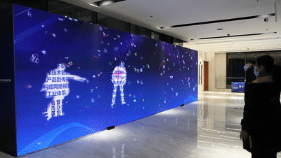 无人交互时,面对观众的是湛蓝色的幕布,滚动播放着产业园区优秀企业的logo。