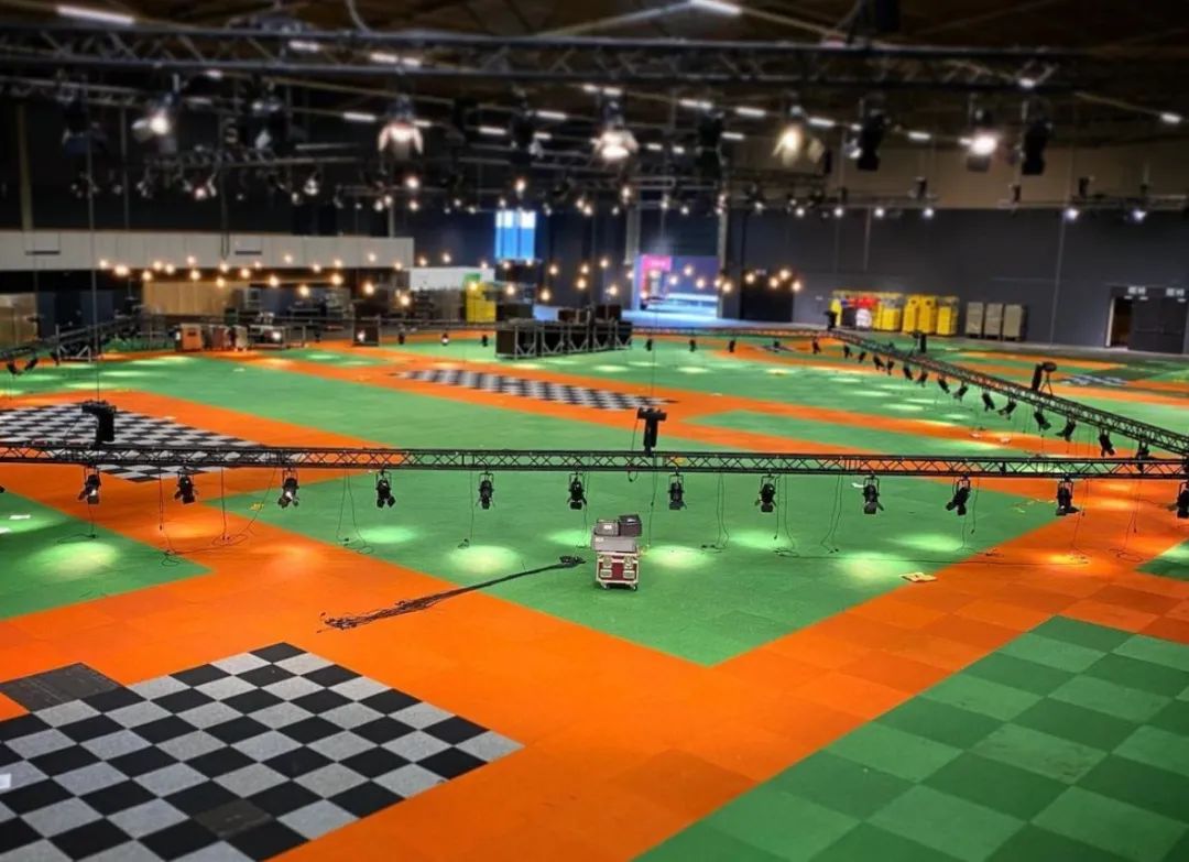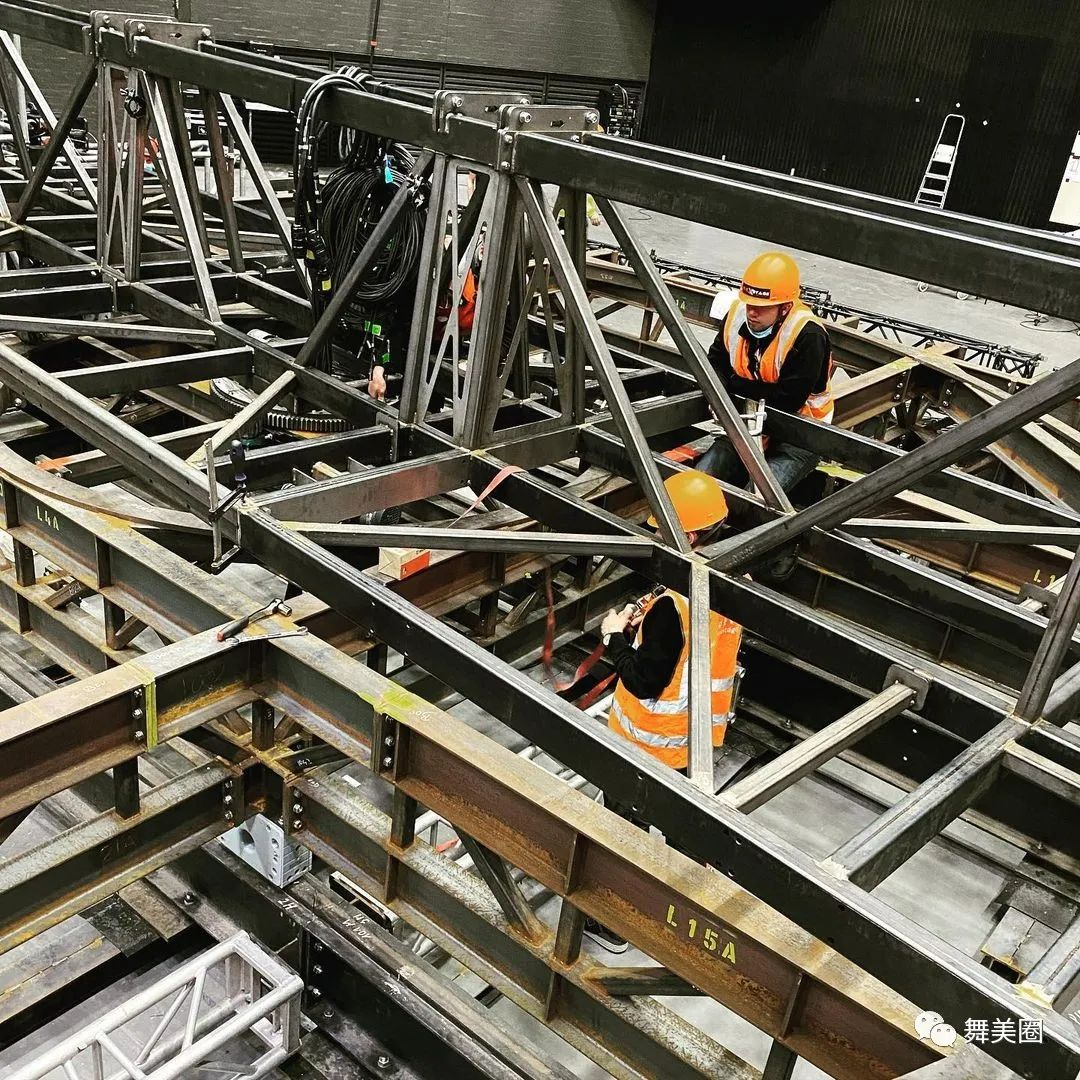 桁架部分已经安装完成,除了灯光设备和扩声设备,还包括供电系统,这样可以减少电缆的长度。地面已清理干净,接下来可以开始地面部分的施工。