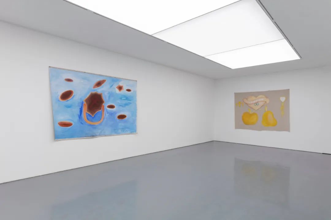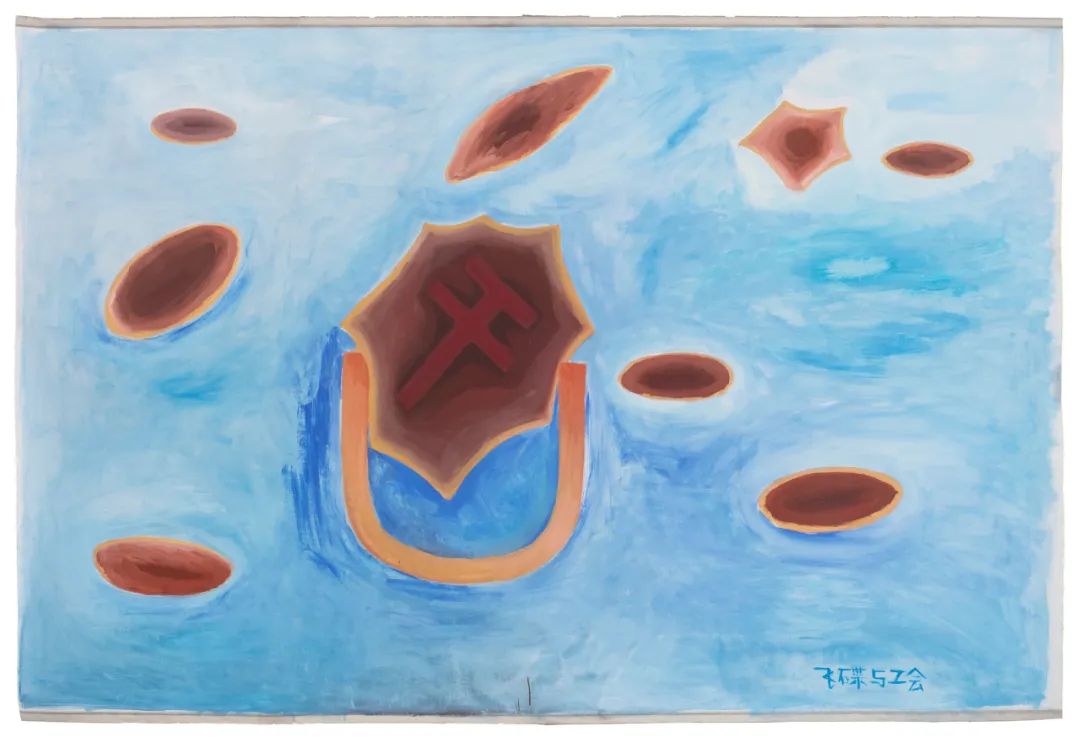 《飞碟与工会(蓝底 干 U 椭圆)》中的“U”以文字的形式直指“工会”的英文“Union”。中国企业中普遍存在的“工会”实质属性是一个企业/机构的文化团建部门。工会充分扮演着传递企业价值观的角色,像吸力强劲的U型磁石,将劳动力紧紧地吸附在为企业创造剩余价值的实干之中,让生产力达到自由资本社会难以企及的统一和高效。廖国核对“U”的处理是飘渺且不真实的,它与代表科技的“e”和代表道德价值标准的“干”并置于悬空之中,共同代表着现实社会结构中自上而下的一种不可抗的、精心矫饰的暗权力被提示在整个展览之中。