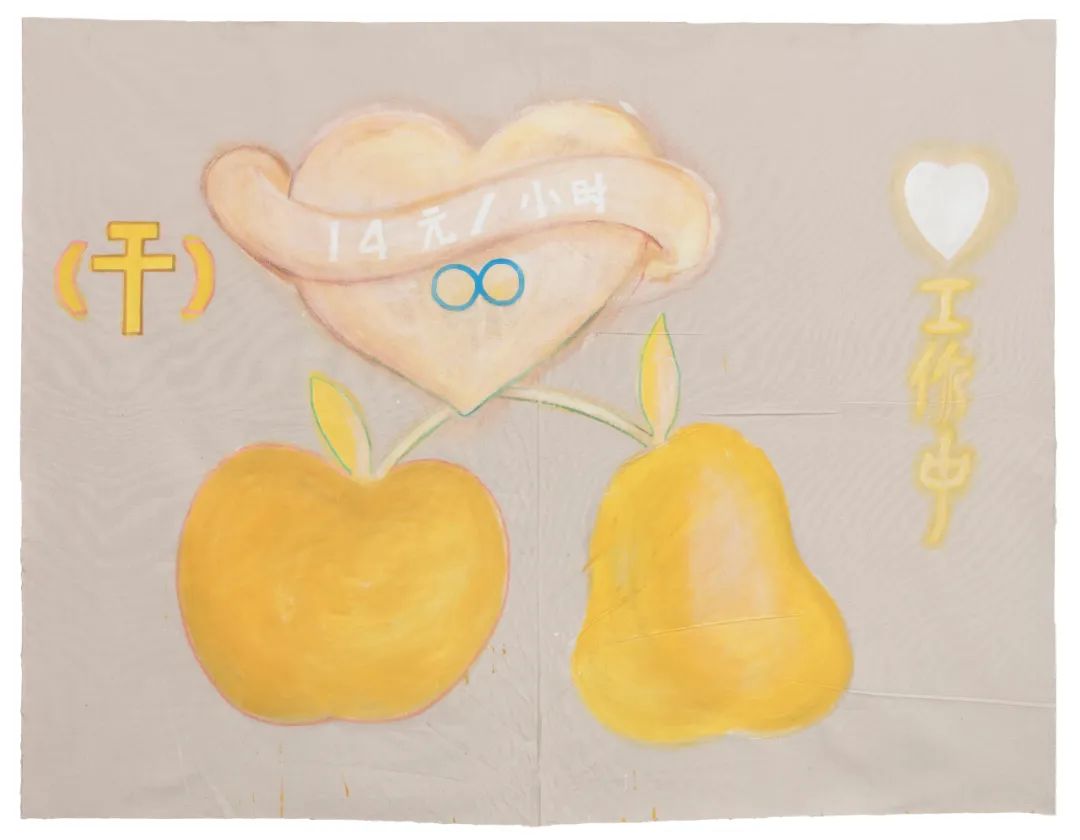 “劳动力”这个概念代表着平权的、发展的、进步的社会力量成为新中国发展过程中最依仗的资源,为现代化建设提供着长久的动力。而与之对应,“民工威武”就像是个久远的、颂扬的口号。展览中,《民工威武 MG VW》将该口号的拼音字母设计成名牌汽车商标的视觉,在玄色的背景中仿佛车头灯一般炯炯神气,尖锐又直接。热情洋溢又微微颤动的“招工”二字,在《招工(红白放射状,蓝螺旋线)》醒目的红色和漩涡的构图中无限放大着诱惑力,经过短暂的视力不适后,你似乎更加相信它会为你带来充满斗志的一天;《无题(干 14元/小时∞苹果梨心形工作中)》里,金苹果与金鸭梨正为工人们辛勤的劳动补给着充足的养分;《新劳动 人生力 88 干)))》里,“干”字口号将成为民工们新的火箭,带领他们获得无穷力量,一飞冲天。