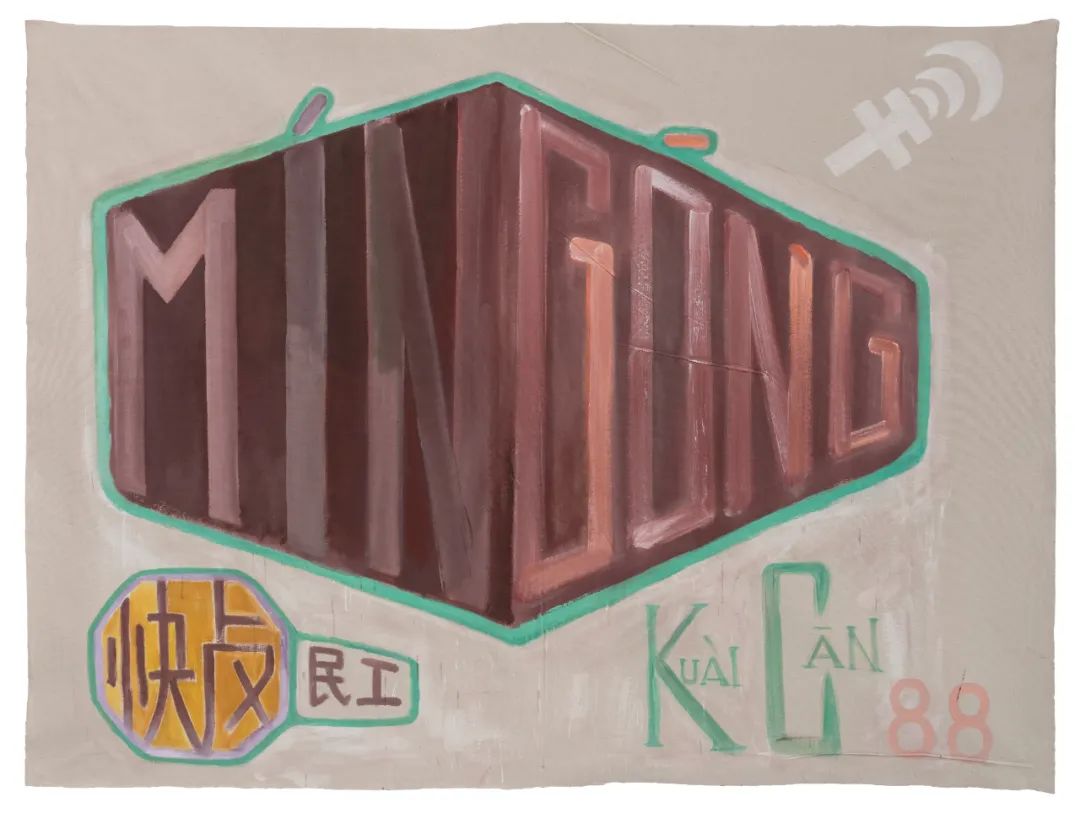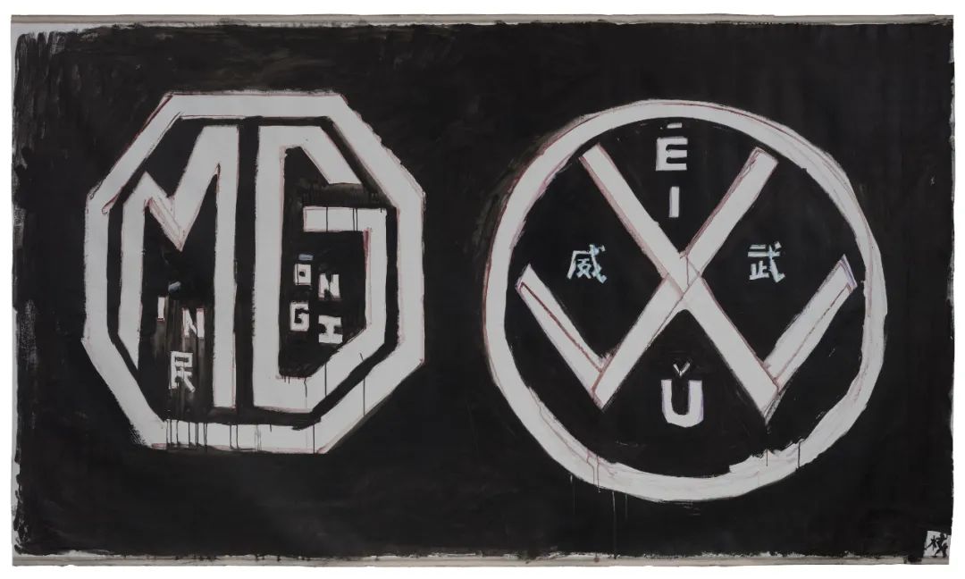 《无题(快餐 兔子 鹅 MinGong)》中logo化的“MinGong”字母像街头的霓虹招牌一样醒目,它不仅仅回应了展览开题的《民工威武 MG VW》对汽车商标图形的挪用,同时也揭示着中国部分都市步入后工业化社会和消费时代,社会底层在未曾满足个体生存的必需之时,却盲目地掉入消费主义的漩涡,以“耗尽自我”的方式来实现虚妄盲目的经济消费与扭曲的自我价值。