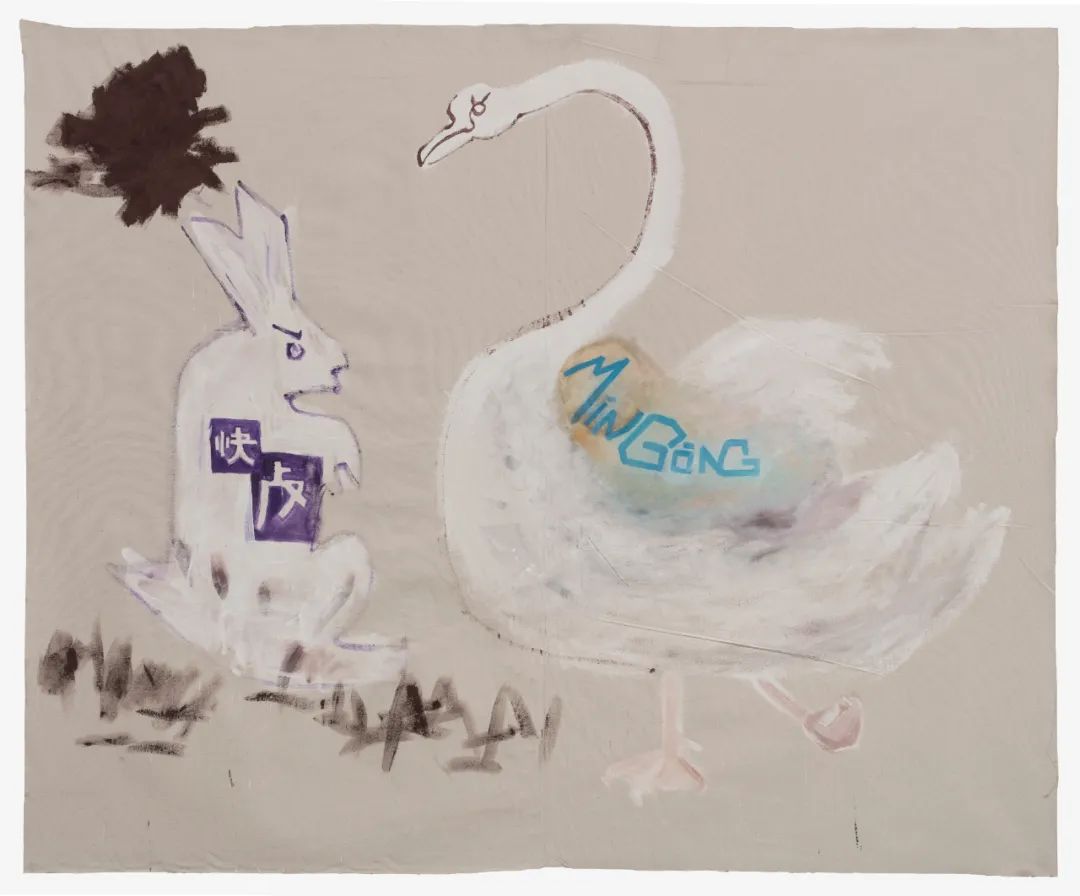 廖国核,《无题(快餐兔子鹅 MinGong)》,2020,布面丙烯,182 x 222 cm