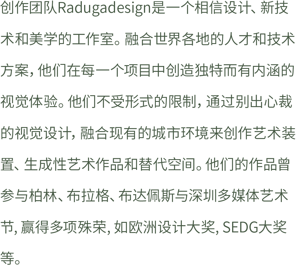 ENCOR STUDIO是成立于瑞士日内瓦的数字艺术团体,团体擅长大型投影项目、音画交互、灯光装置和CG影像等方面的创作。他们的作品简约、当代、充满力量,且擅长与品牌配合,在偏向商业类、公共类的项目时,他们以Supermafia的名字出现,在更艺术类的创作中,他们是ENCOR STUDIO。