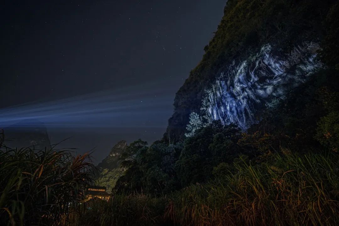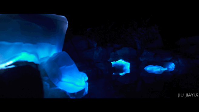 2020年年末刘佳玉创作了自己的个人艺术作品《逆流而上》,作品首展于桂林阳朔。这件作品的灵感正来源于刘佳玉在阳朔的旅程,在旅程中她得知桂林当地的山体几亿年前都隐藏于海底,而经过几亿年的地壳变迁,这些山体破水而出,变成了今天的样子,于是她便想要在这些山体之上创作一件作品。该作品以上亿年来由于风化和水流侵蚀自然形成的山体作为呈现媒介,通过Houdini对使用无人机3D扫描得到的山体表面模型进行真实的水流数据的生成,此后再将真实水流数据使用VVVV进行再次渲染演算与视觉风格塑造,并将其生成的立体投影以水墨式的漂浮效果呈现于山体表面。与此同时,使用水流数据模拟生成的数字化自然声音与计算机渲染时所产生的工作音效相互合成,与影像共同呈现。在国内疫情得到有效管控的情况下,更多的人们开始国内游的度假方式,这件作品展示在一个度假空间中,同时这块裸露的山体也是度假空间中的攀岩场地,在作品展出期间也进行了攀岩表演,希望透过作品在疫情当下传递“逆流而上”的精神主旨。