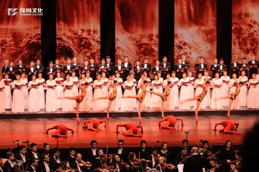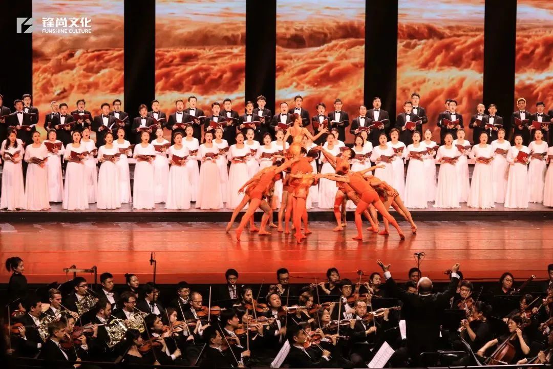 当《保卫黄河》的号角响起,舞台上的每一位舞者、演奏者、合唱者都无一不在刻画曾经那些保卫家园、抵御外敌的无名英雄,用艺术家们的乐器、歌喉、肢体语言来奏响英雄之歌。而灯光则化身为滚滚黄河、赤火烈焰,承托着民族的脊梁、信念的坚守,使命的召唤。