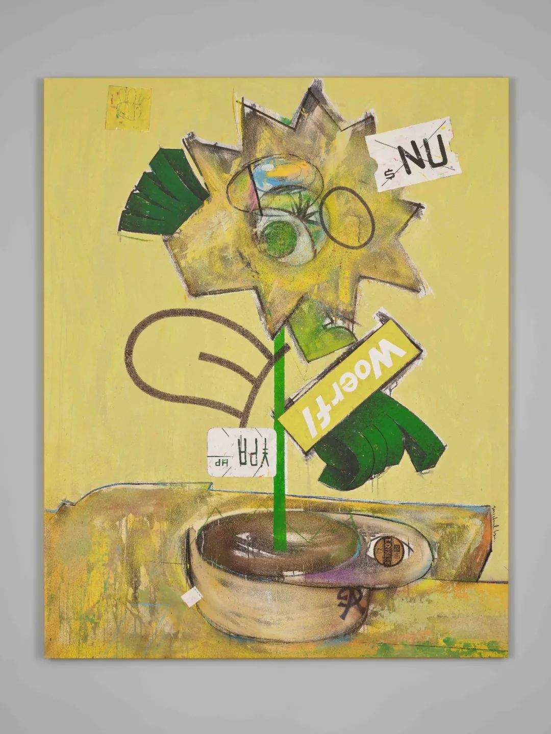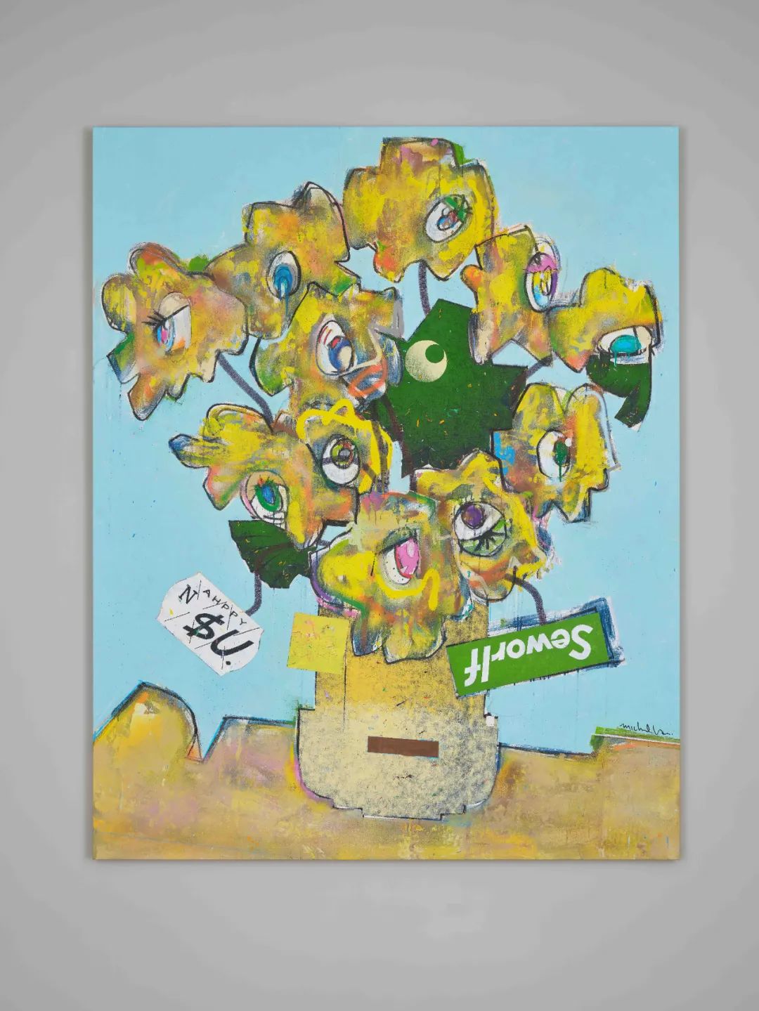 同个空间内悬挂的两件大尺幅花朵绘画,是香港“Figure教父”刘建文2020年的新作——倒置的鸭舌帽与T恤,花蕊处忽闪忽闪的萌动大眼,由艺术家取材自不同的卡通玩具。同时,文字、蜜蜂、美元标志等图示以拼贴的形式轮番出现,这同样也是艺术家充满戏谑、却又独特的视觉宣言。