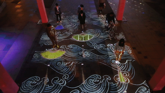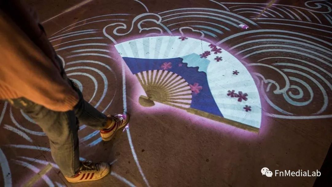 参与者进入体验区域踩中扇子底部就可以打开扇子,以观赏扇子内部视觉效果,每次扇子的闭合都会带来全新的内容。我们希望通过以和扇为载体,以当代的创作手法将各种日系元素内容很好的在扇面上挥毫,进而融合到大的扇阵中去以动态形式展现给观众。让大家可以从这样互动体验中去很好的体验本次活动想要传达的主旨内容和初衷。现场在整体将近6米宽10米长的区域内,我们会设定了18把的扇子影像,从而形成一个扇阵影像的场域空间,在背景波纹的映衬之下,18把扇子内藏着的不同故事将会与参与者不期而遇,进而置身参与形成大开大合的壮观场景。