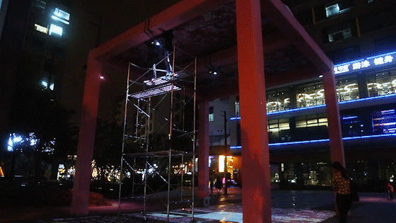 在硬件技术方面,作为户外装置作品,为了保证观赏体验,我们使用了三台12000投影机进行拼接融合,并且使用了红外识别技术进行人体的检测和跟踪。在室外工作的设备对防雨防水设施也极为重要。