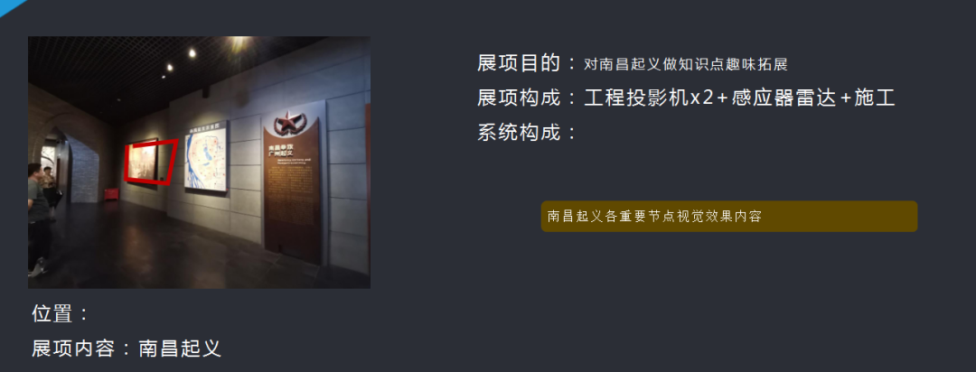 该项目梳理了南昌起义的全过程,以时间节点对应重要事件,采用触摸体验的方式,让观众清晰了解南昌起义全过程以及叶挺在南昌起义中的历史功勋,从而体会南昌起义的伟大意义以及人民军队建设的艰难历程。