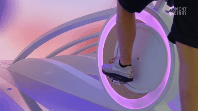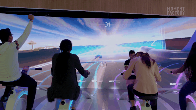 一款模拟赛车游戏,游客们在全沉浸式的赛场骑着“脚踏自行车”,沿着数字光跑道一路驶向终点。巨大的屏幕将参加者带入风景靓丽辽阔的世界,进行一场激动人心的比赛。