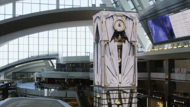 在机场中央,MF团队还打造了一个呼应主题的重点装置——时间钟楼。除了播放实时更新的故事短片外,考虑到屏幕过于虚拟和冷感,故以机械咕咕钟为灵感,让钟楼和环绕屏幕在准点切换真人报时舞蹈,既达到提醒旅客时间的作用,也让他们在候机的空隙获得环抱式的娱乐化体验。
