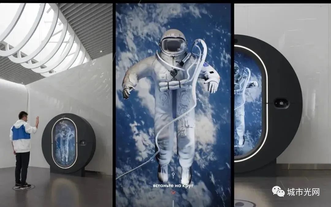 在登记区,巨大的35米大屏幕迎接各位前来的参观者,在等待飞行的过程中,乘客可以试穿虚拟宇航服。