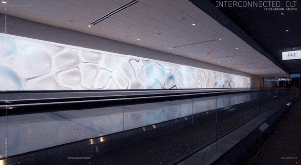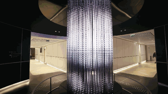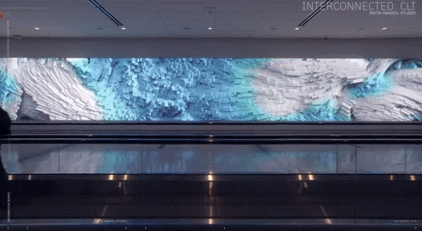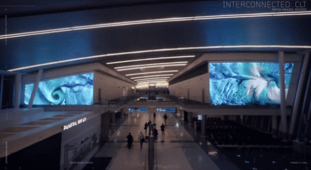 大堂内共有三个巨大的LED屏幕,三个屏幕分别演绎不同的视觉章节:流体结构、不可能的材质、数据诗。播放不断变化的数字艺术作品是实时生成的,以实时的机场运营数据为模型,范围从飞行时间和穿梭巴士往返到出发和到达。