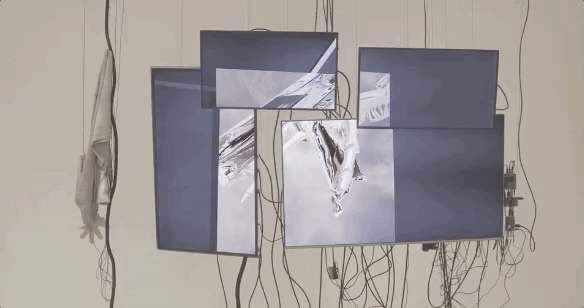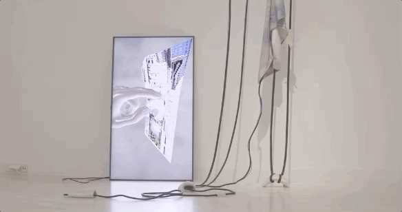 这个作品既是一个雕塑,也是一个视频装置,它提出了虚拟与现实之间的阈限空间、数字的物质性与过时的问题。