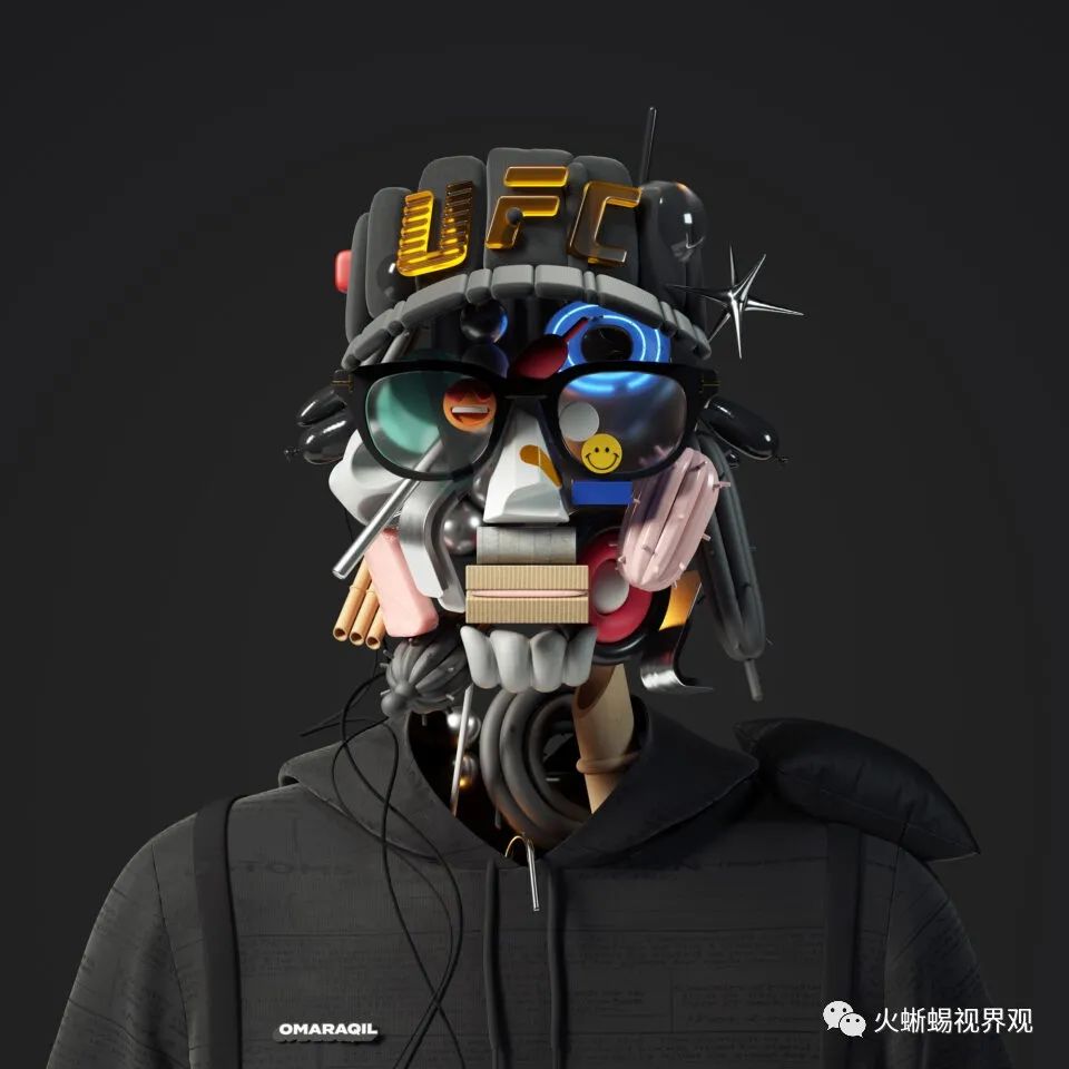 Omar Aqil(奥马尔·阿基尔)最近的作品是利用数字技术组装技术、3D物体和纹理块制作了自己的自画像。这些未来主义的角色都戴着一副眼镜,但在其他方面都很独特,有时通过层叠成面部特征的圆滑几何形状来表达,有时则表现出异样的花朵和各种有机元素。“实验”和“玩耍”是这个新系列的核心-----Omar Aqil(奥马尔·阿基尔)称之为“头像”,这样各种抽象的人物和色彩斑斓的组合真是视觉的享受。