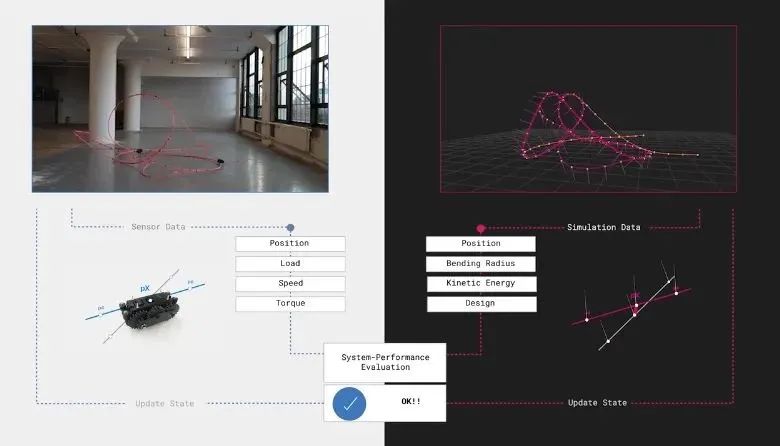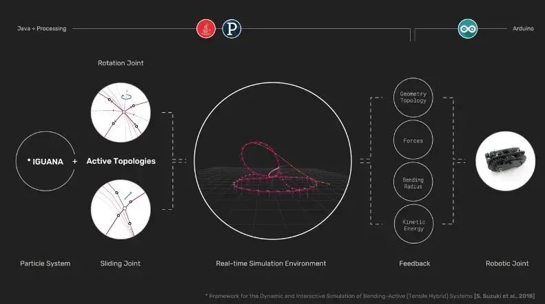 Mathias Maierhofer和Valentina Soana在计算设计与建设研究所创建了 ,该项目旨在挑战(数字)设计与(物理)操作流程之间普遍存在的分离自适应和交互式建筑系统。该项目提出了一种混合方法:实时、交互式的设计和操作过程,使(材料)系统具有自我意识,可以充分利用和探索其动态设计空间,以实现自适应目的。该系统同时具有物理实例和相应的数字孪生模型,它们会根据来自机器人关节的Arduino控制的传感器数据通知的处理仿真反馈,不断增强物理性能。