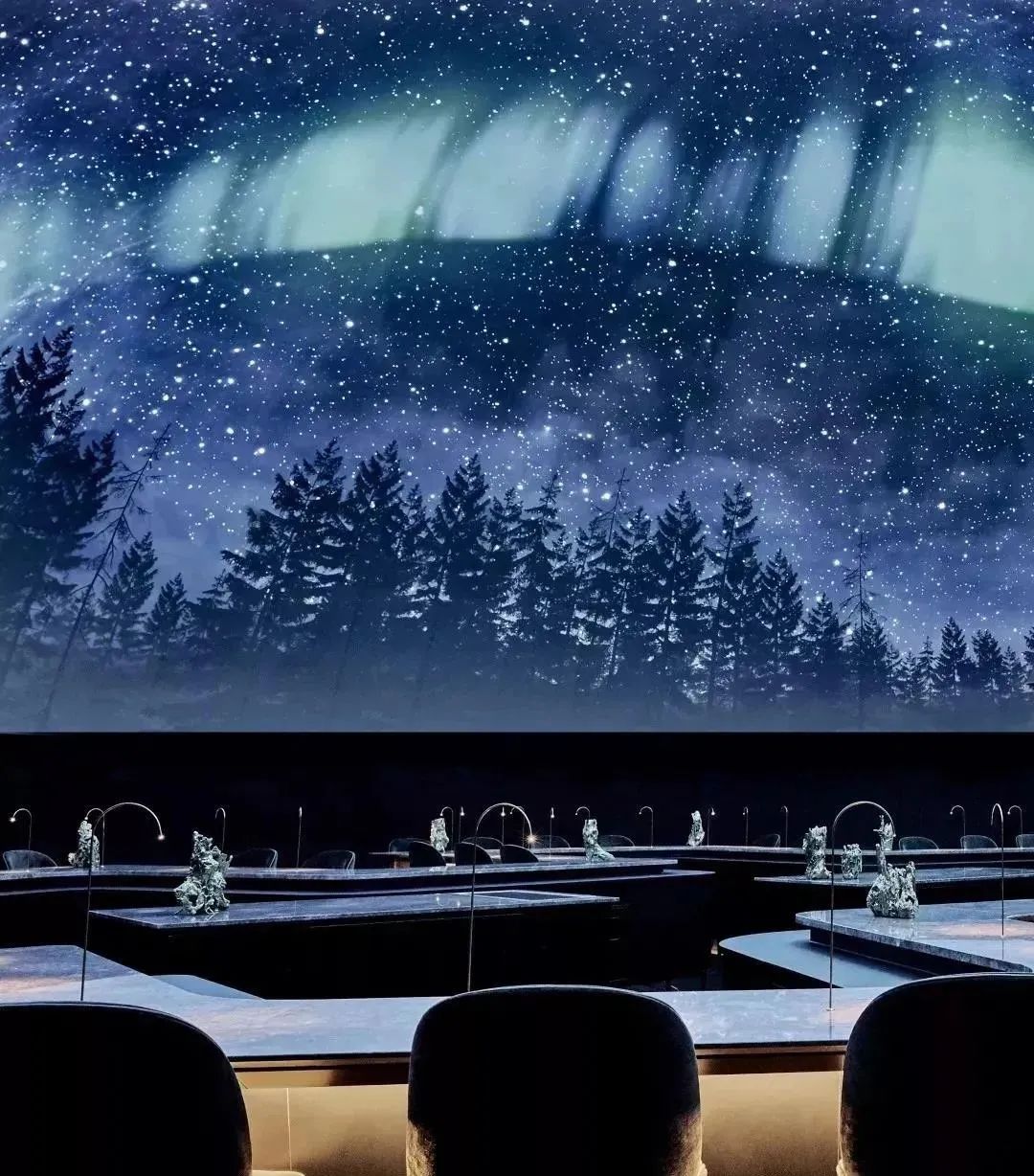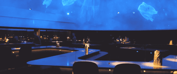 一进入餐厅,就会被眼前的景色所惊叹,充满萤火虫的森林美景,北极夜空中出现的极光,游动着水母的深蓝色海洋。