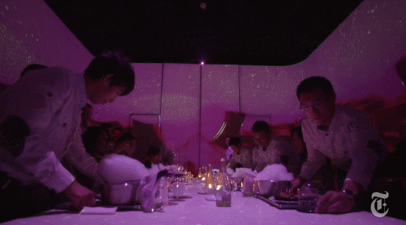 包含视觉、听觉和嗅觉元素的全面组合,结合了视频、音频、定制照明、管道中的气味,依照每道菜式的味觉主题而量身设计的情境,进而提升对盘中美食的感受。