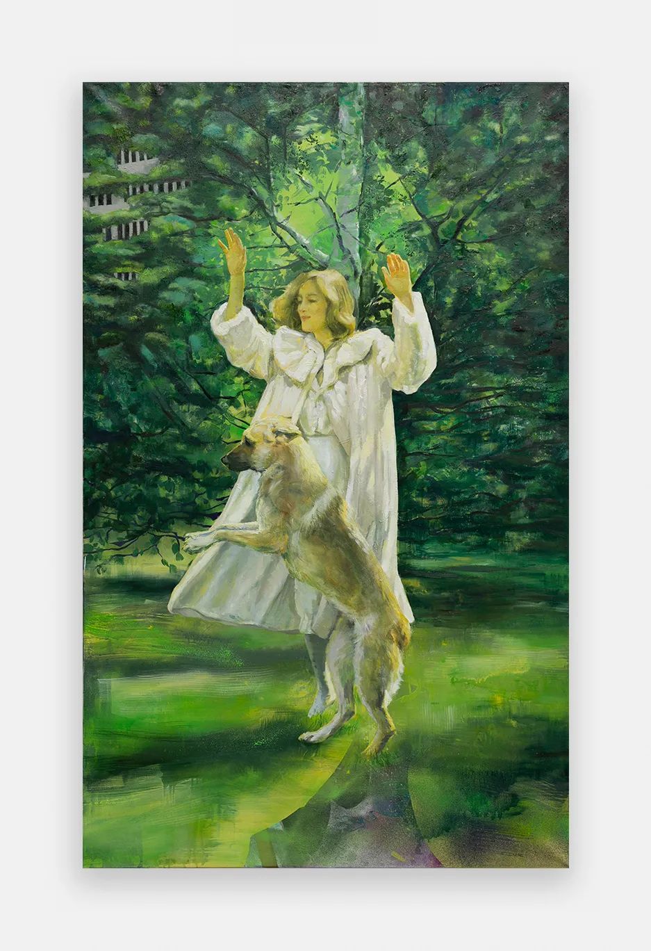 A:布展是根据白天和夜晚的颜色准备的,按顺时针方向由亮到暗进行布展。色彩一开始是明亮柔和的,像是清晨的色彩。《Grazyna, The Modernist》(2021)中代表了正午,描绘的是上世纪70年代的女演员格拉日娜·沙波沃夫斯卡(Grażyna Szapołowska)和她的德国牧羊犬在一个长满绿叶的春日花园中玩耍,其中,带有社会现代主义建筑风格的混凝土建筑隐约可见;在《少女钓鱼为波希米亚的梅莱夫》(Maidens Fishing for Bohemian Merelf, 2021)中,两名巴伐利亚少女在玩木棍,遇到了水怪。总之,我创作主题的内容会随着图像中符号、幻象和星星的暗度而变化。