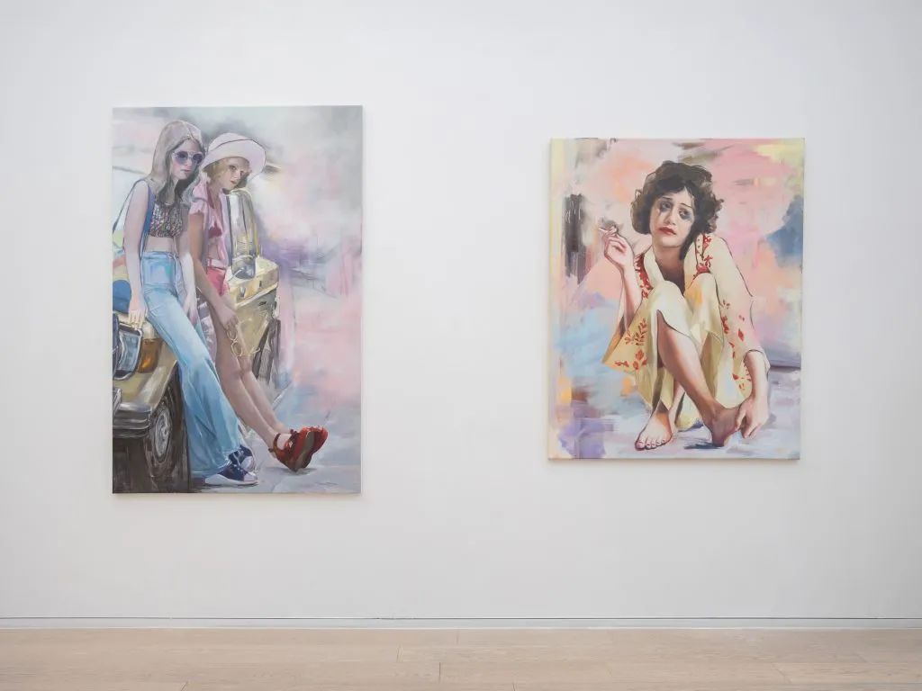 还有,每幅画中都有二重性。比如,我们认为我们见到的是宁静和美丽,但实际上每幅画都呈现并承载着一种内在的戏剧性,或包含着一个真实的故事。例如,《Night Discontent, Day Drama》(2021)虽然看起来轻松愉快,但实际上它讲述的是两名未成年女性作为性工作者等着上夜班的故事。我的一个朋友Diana d’Arenberg把它描述为“死神遇上爱神”,我很喜欢。