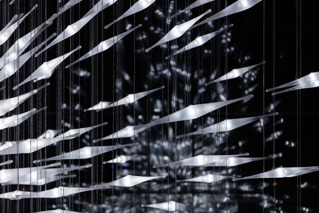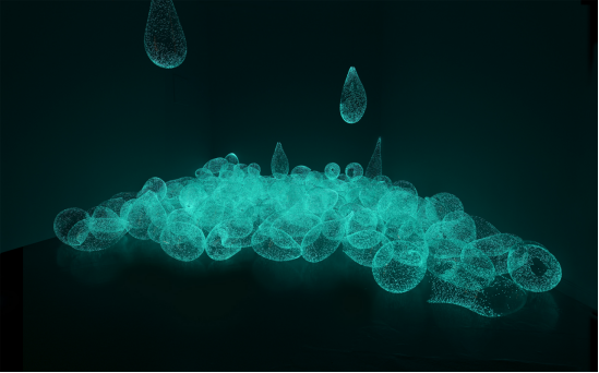 日本艺术家和教育家Rui Sasaki在淡淡的蓝光下通过精致的玻璃制品见证了不可预知的天气,这种互动作品将不可预测转化到了雕塑上,类似人与人之间的亲密过程。200个含有磷光材料的玻璃雨滴,通过与人类进行互动激活自身,在其最亮的时候磷光晶体是绿色的,然后逐渐变为蓝色。
