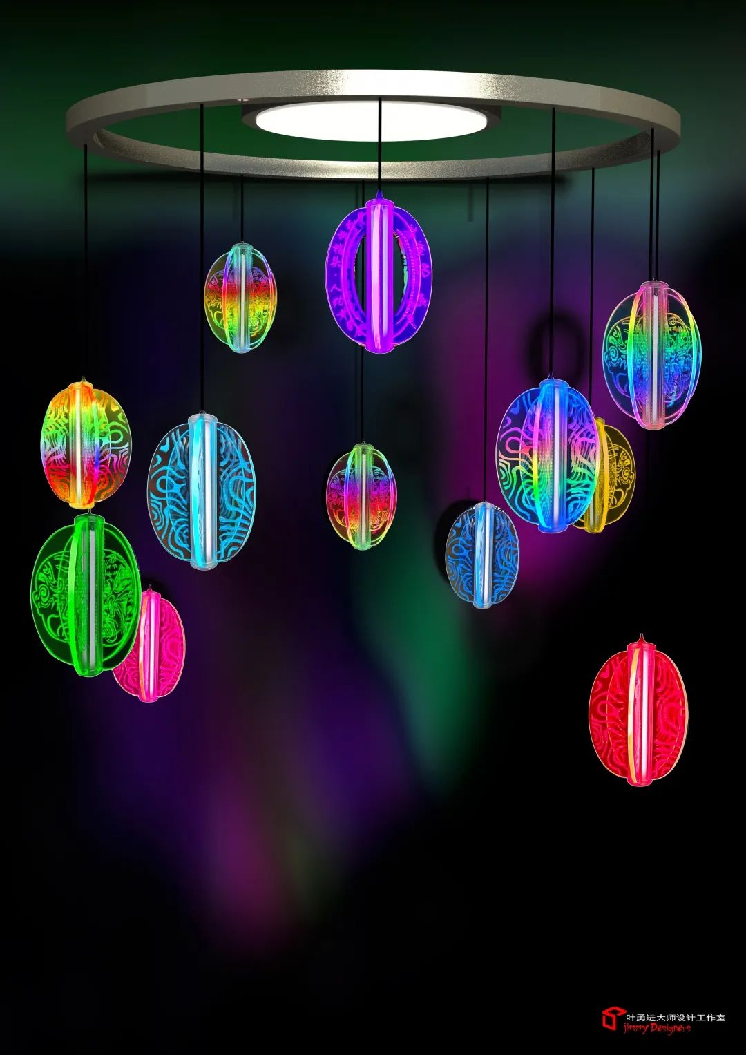 该款设计是一个传统文化与现代时尚元素结合的一款造型灯的设计。图案可以采用文化、诗词、书法及时尚符号图样。造型可大可小、大小大小穿插,这样可以使空间的变化更加丰富并且与多样造型完美结合。