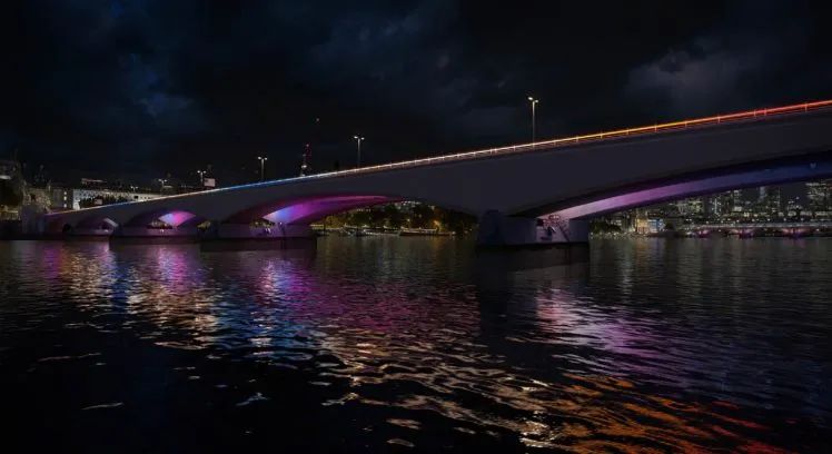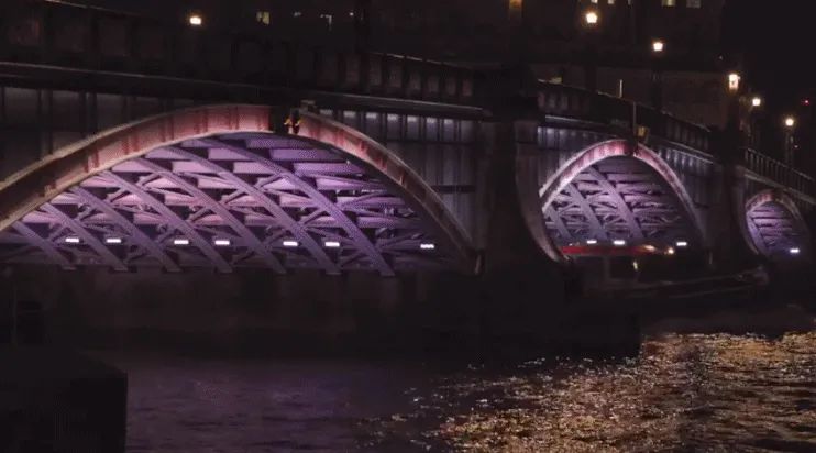 光影映射着周边,喧闹和安静在此交汇,泰晤士河上的桥有着温暖的色彩。玫瑰色灯光贯穿了黑衣修士公路大桥的拱门;一条简单的光带贯穿滑铁卢桥柔和的色彩,照亮两侧桥墩的中央;动感色彩渲染出火车经过的震荡与轰鸣,坎农街铁路桥满满的“铁路意味”勾勒出城市的活力;兰贝斯桥的主色调与英国上议院皮革长椅的红色相呼应;桥洞下方不太张扬的绿色灯光点亮西敏桥,激活独特的网格图形。