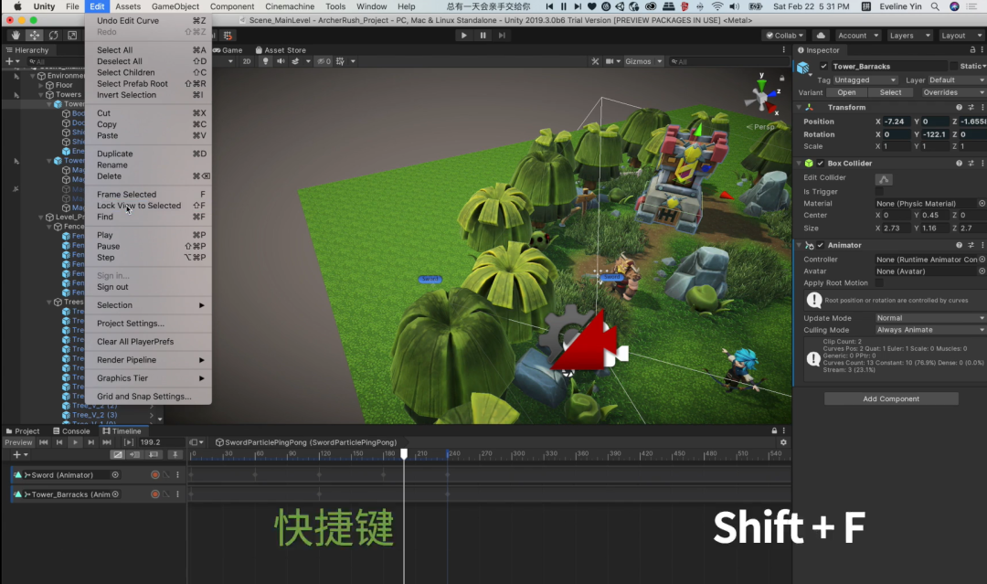 如果对象是动态的,在对象被选中的情况下,点击菜单 Edit > Lock view to selected(视图锁定所选对象)或者快捷键 Shift+F,场景画面就会快速锁定在这个移动的对象上。