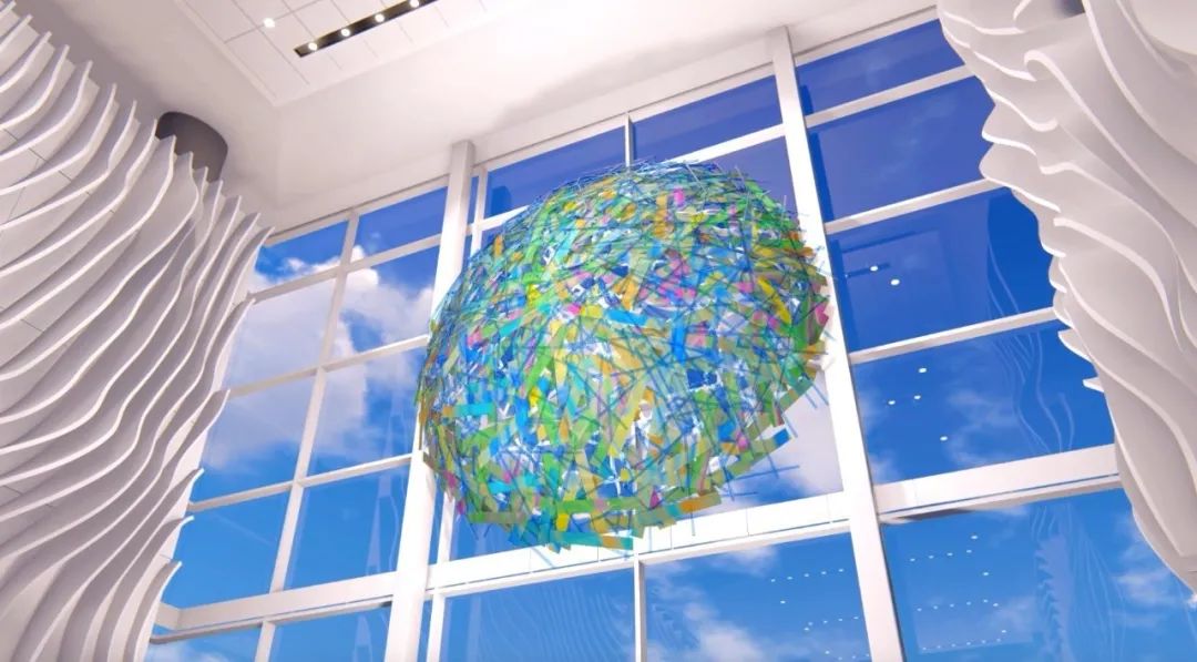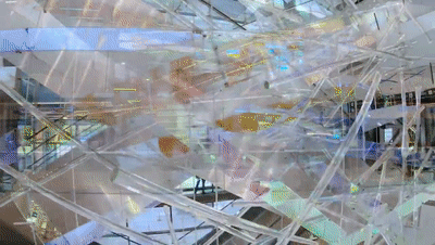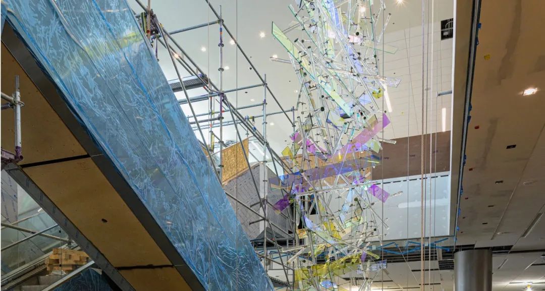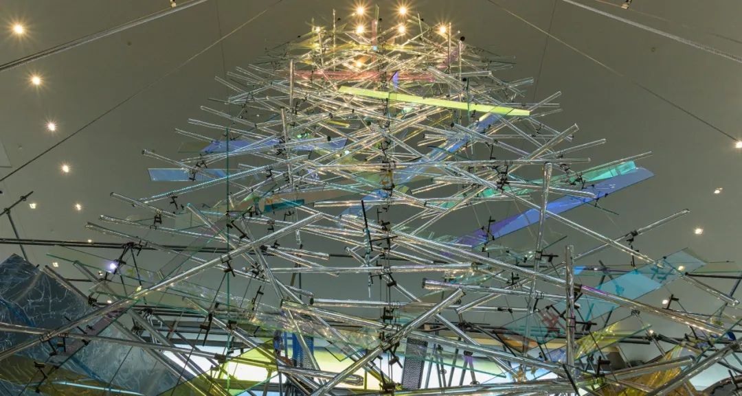 从天花板到地面,大约有六层楼高,悬挂的雕塑利用了这个位置接收到的自然光,通过搭配彩色的、对光敏感的二色玻璃板和光折射玻璃棒,创造了一个惊人的不断变化的颜色和图案的阵列。