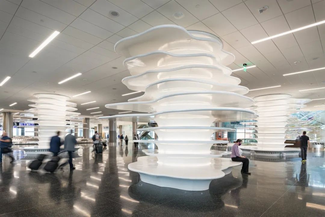 雕塑式的柱板和候机厅长凳,位于新候机厅的到站和离站乘客的聚集区,将为在开放空间中进行的各种活动创造视觉上的区别。