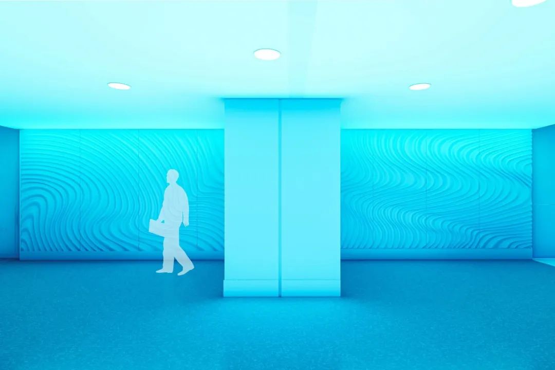 LED照明将各种蓝色灯光投射到鳍片上,并加入声音,以完成此装置的河流效果。