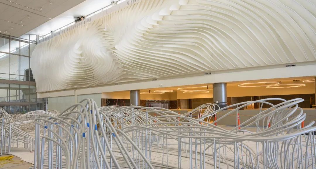 在新航站楼的自动扶梯井里,是Gordon65英尺高的装置,名为《The Falls》。与《The Canyon》类似,这个装置的灵感来自于犹他州峡谷景观中的瀑布。