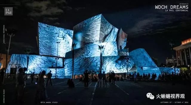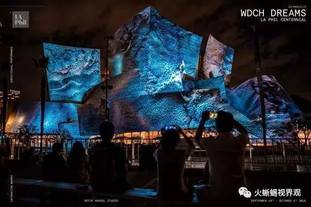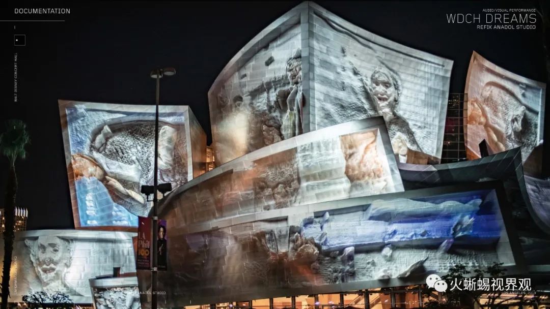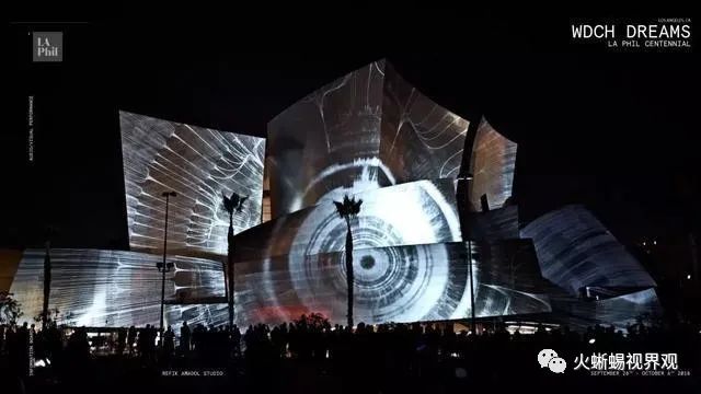 这个项目是为了庆祝洛杉矶爱乐乐团100周年而做的设计。它以动画、数据驱动的模式,将爱乐乐团的影像投射到迪斯尼音乐厅上。设计师希望创造一个能让数据和图像结合在一起的人造“大脑”,以模仿人类梦境中的感觉。Anadol擅长数据整合创作,于是他提出:“用一种创造性的、计算机化的“大脑” 来 模仿人类 如何做梦,通过处理记忆来形成图像和想法的新组合。”