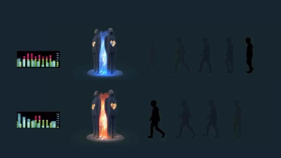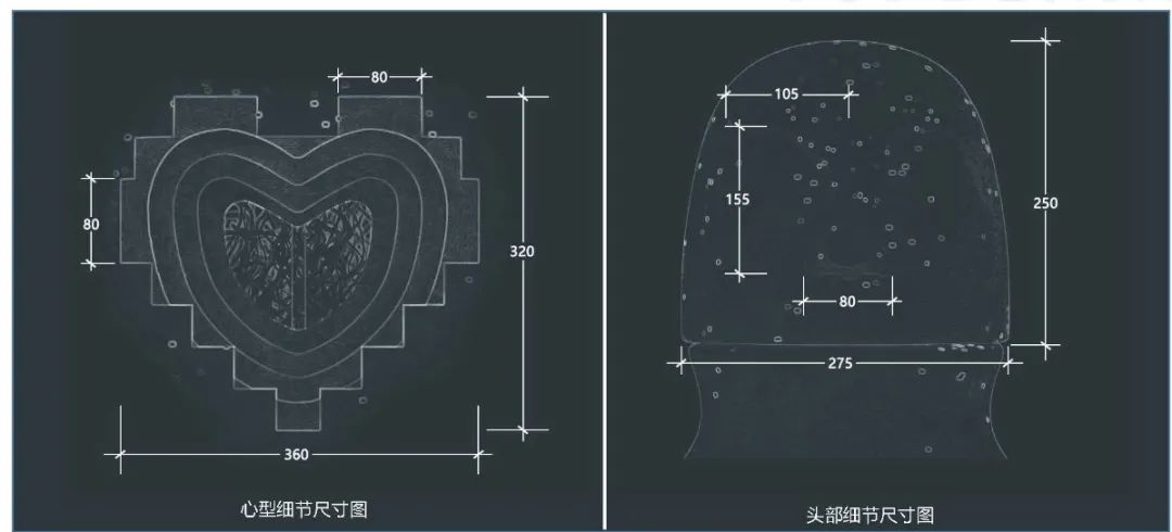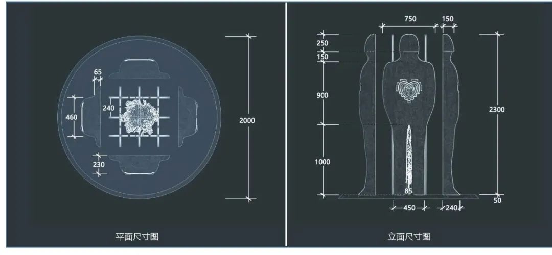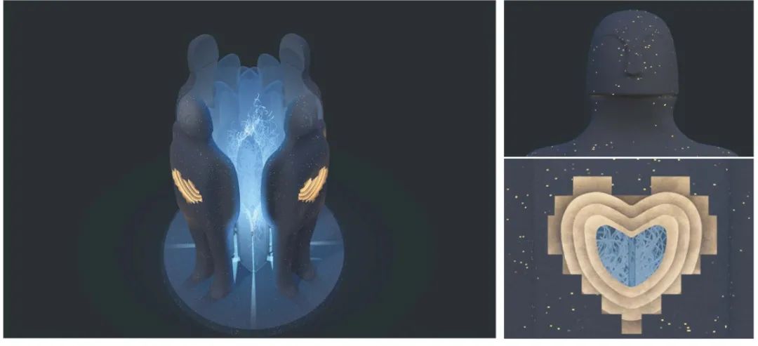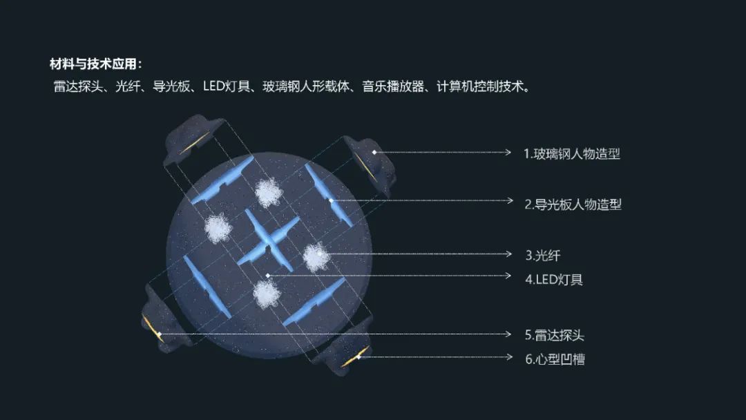 本作品应用的材料主要以玻璃钢做人物造型,身体1.5M高的位置挖出“心”造型空间,藏柔性灯带。