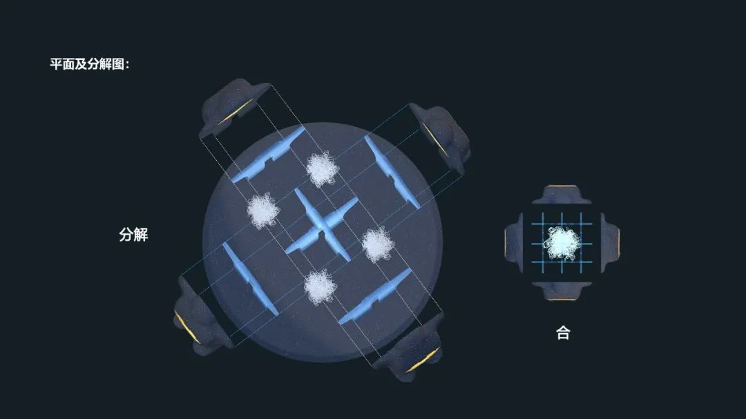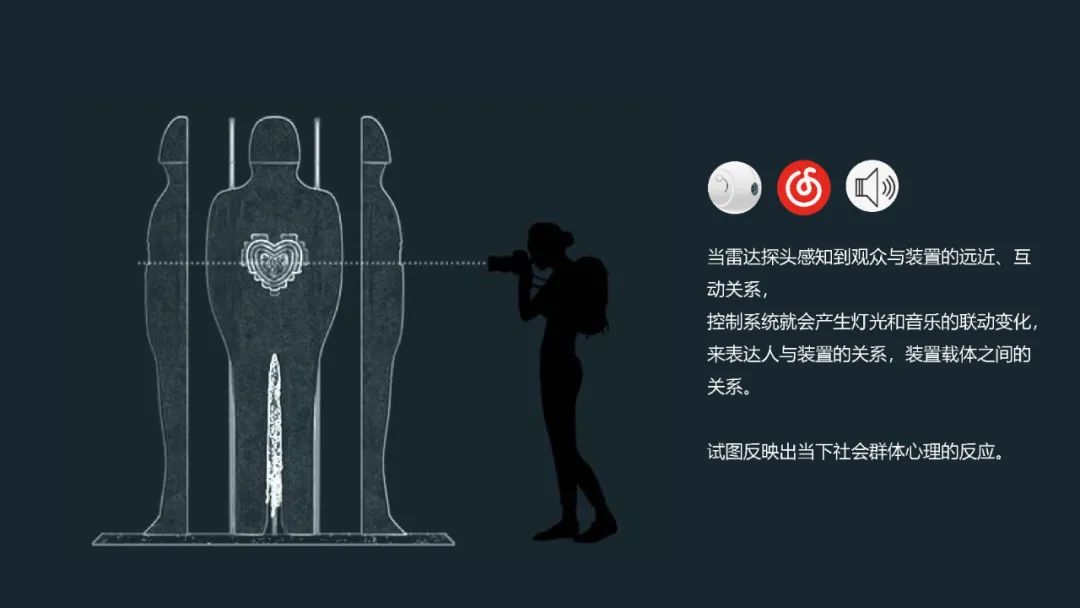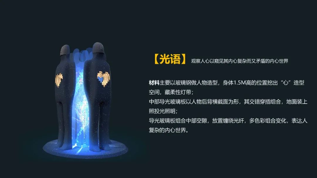 中部导光玻璃板以人物后背横截面为形,其交错穿插组合,地面装上照投光照明;导光玻璃板组合中部空隙,放置缠绕光纤,多色彩组合变化,表达人 复杂的内心世界。