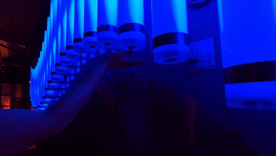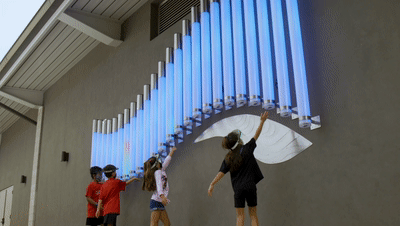 装置由24个完全互动的声光管组成,邀请学生彼此互动,并希望激发他们发挥自己的创造力。每个管子都包含传感器,用于测量下方的运动并触发自定义电路,该电路可更改光、颜色并产生音符,让用户像竖琴一样演奏乐曲。