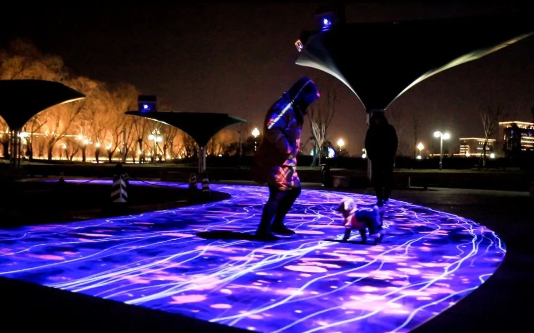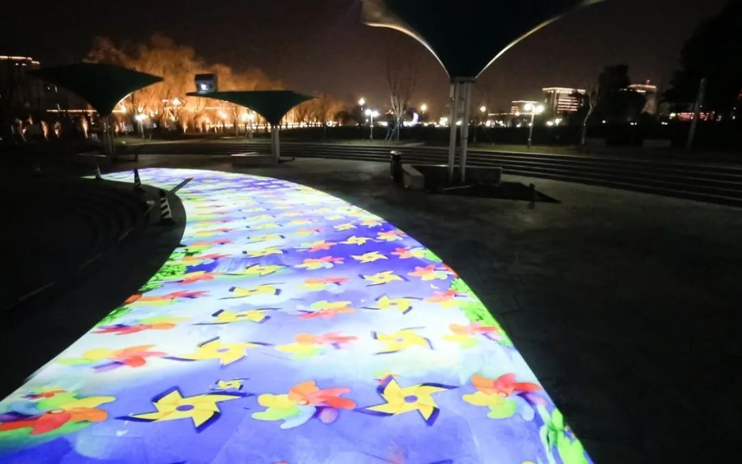 夜色中的明湖公园,当地幕投影秀拉开帷幕,各种引人入胜的场景交替变换,时而是海浪阵阵的沙滩,时而是清新浪漫的花海,时而是充满童趣的风车和彩色泡泡,时而是色彩各异的钢琴键盘……