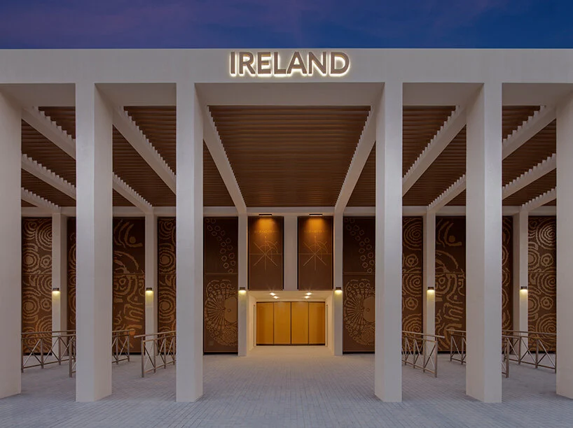 爱尔兰馆由ciarán o 'connor设计,包括两个相互连接的结构:眼洞和花园。“眼洞”是主要的结构空间,由一个圆形的房间组成,上面覆盖着一个可以看到天空的锥形漏斗——灵感来自新格兰奇的巨型灯箱,它朝向冬至时升起的太阳。