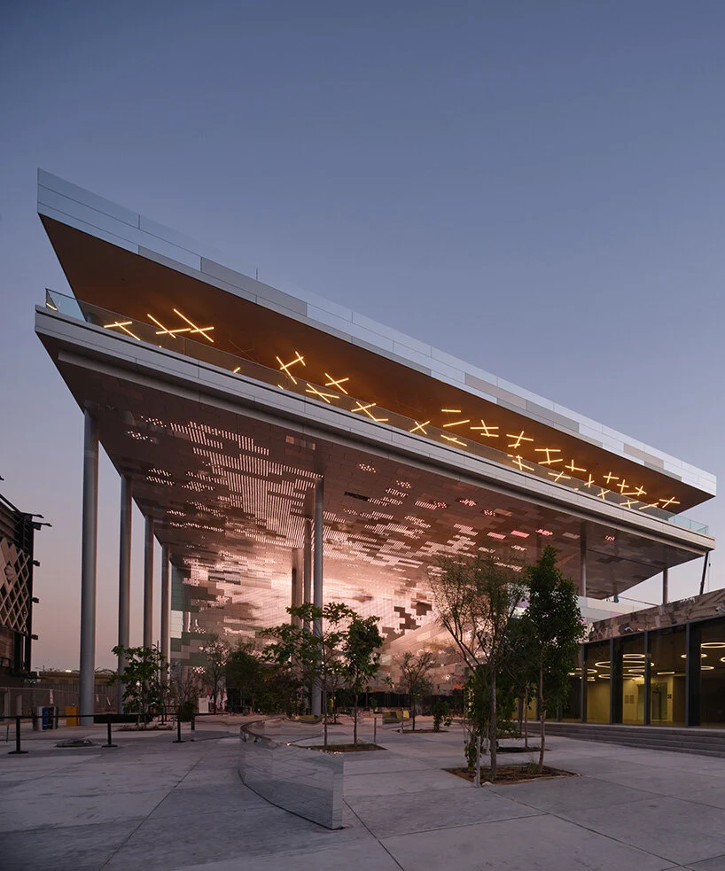 日本馆由长山裕子设计,其立面结合了传统的蔓藤花纹和浅麻叶图案,代表了日本与中东之间悠久的联系和文化交汇的历史。