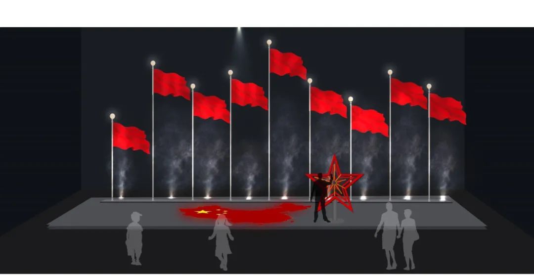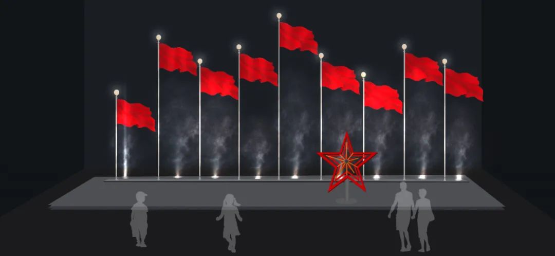 模式:互动(人依照顺序敲响音管,启动灯光、雾森、风动等与旋律《我和我的祖国》互动表演)。装置无人敲击(2分钟)后、系统进入常规模式表演。