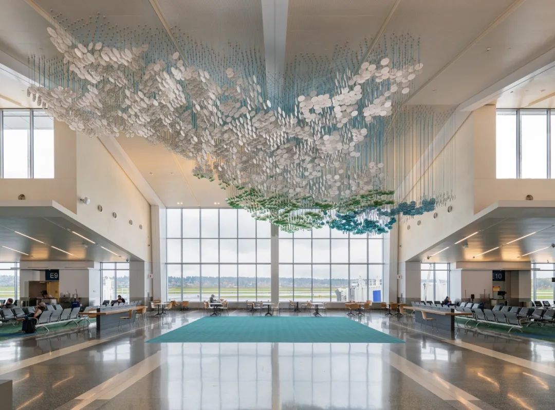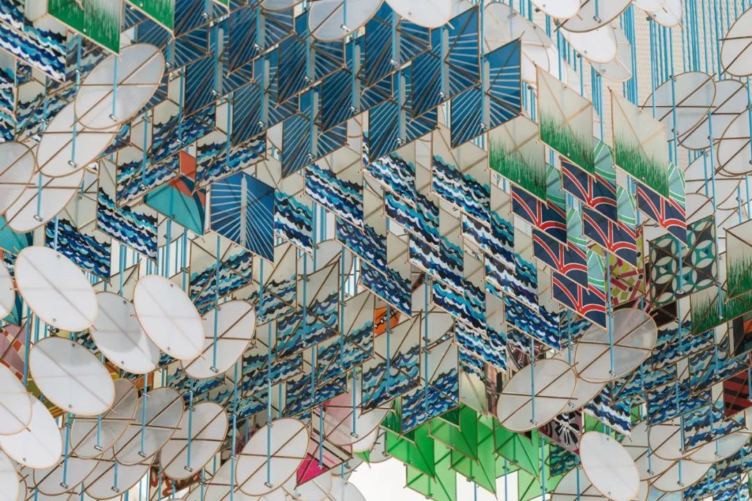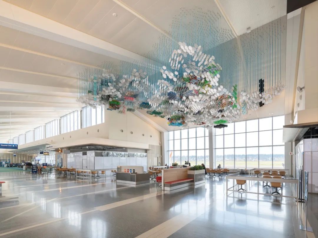 艺术家雅各布·桥本(Jacob Hashimoto)将成千上万个单个球体悬挂在起伏的云状物体中,将中庭和开放空间转变为非短暂性的作品。他说,他特定于现场的装置层有机元素——有些成分印有波浪、银河系尘埃颗粒和其他暗示自然的主题——在"在观众上方攀爬,像波浪一样,在几乎一个简陋的小物体的大教堂里相形见绌"的地层中。