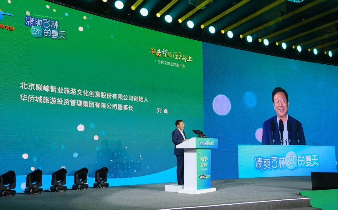 巅峰智业创始人刘锋博士受吉林省特别邀请作为现场唯一专家进行推介,并与著名演员王刚,央视主持人朱广权、李思思,海军政治部文工团国家一级演员闫学晶四位吉林籍明星作为推介代言人,为清爽吉林打Call!