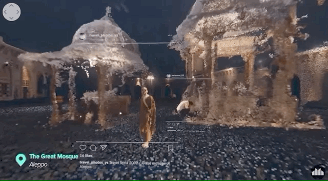他们通过 Instagram —— 人们在我们这一代最大的视觉档案库,将 Instagram 的图片合集创建为共享的集体记忆。通过三种语言的地理标签进行收集阿勒颇三个历史遗址的战前照片,然后通过深度学习算法进行处理,并作为摄影测量数据集进行分析,通过与 Exozet 合作将二维数据集转换为沉浸式 3D 环境,人们可以通过实时和移动 VR 体验再次访问被摧毁的叙利亚遗址。